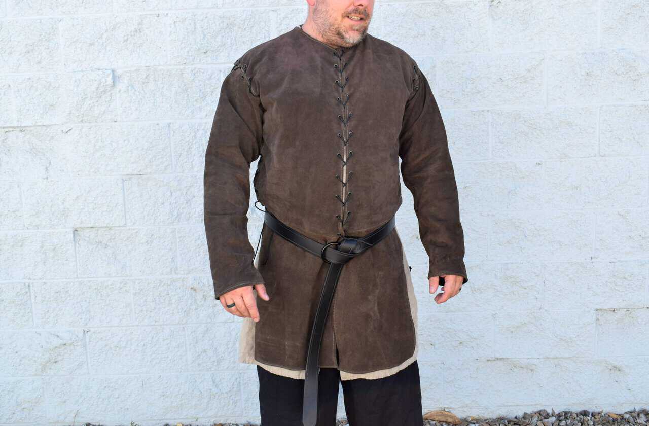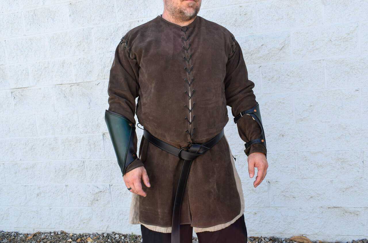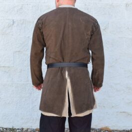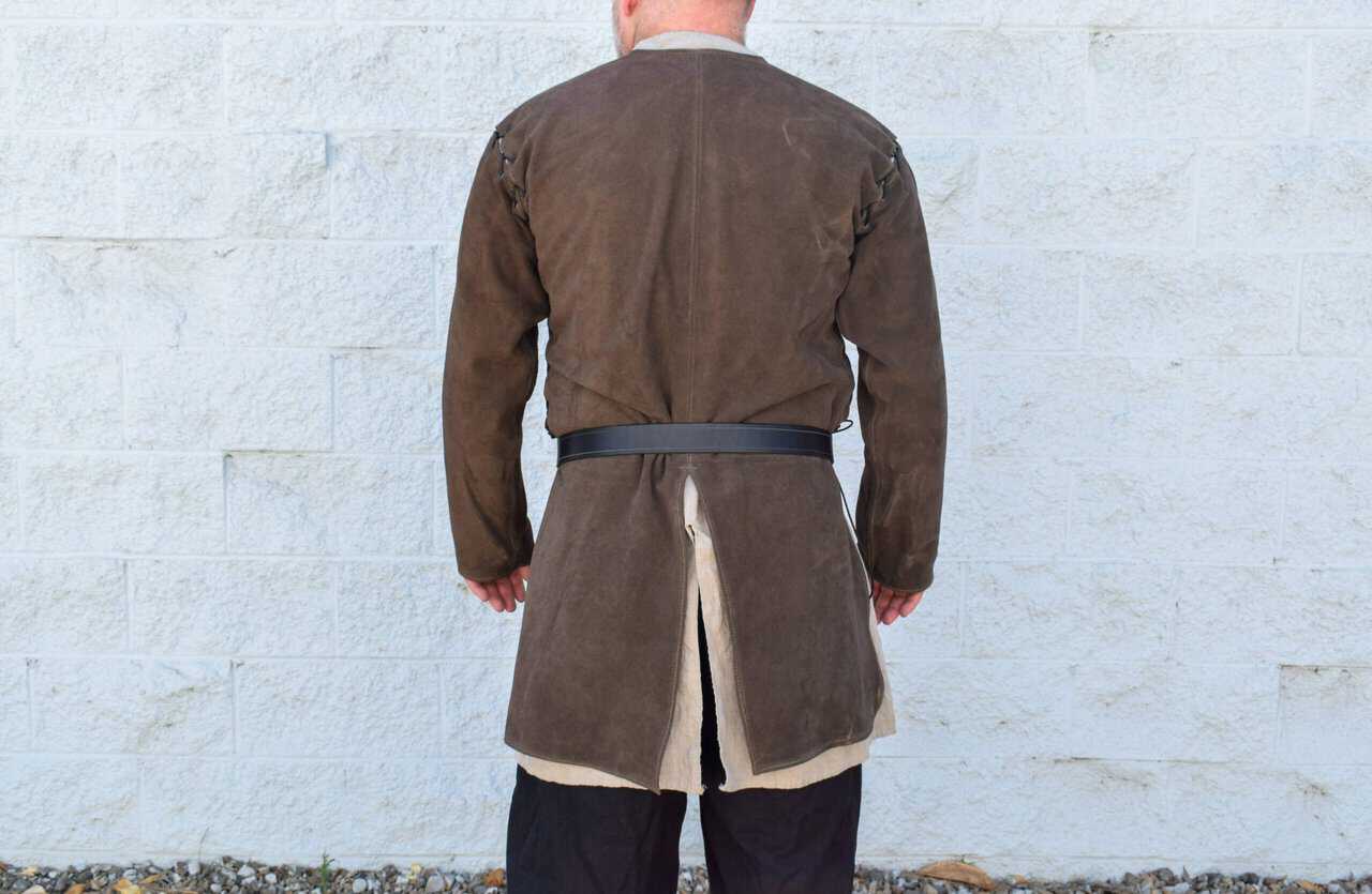 This is a leather jerkin/ jacket made out of 4-5 ounce suede leather. Similar to our standard suede ranger jerkin, but with smaller armholes and detachable sleeves.