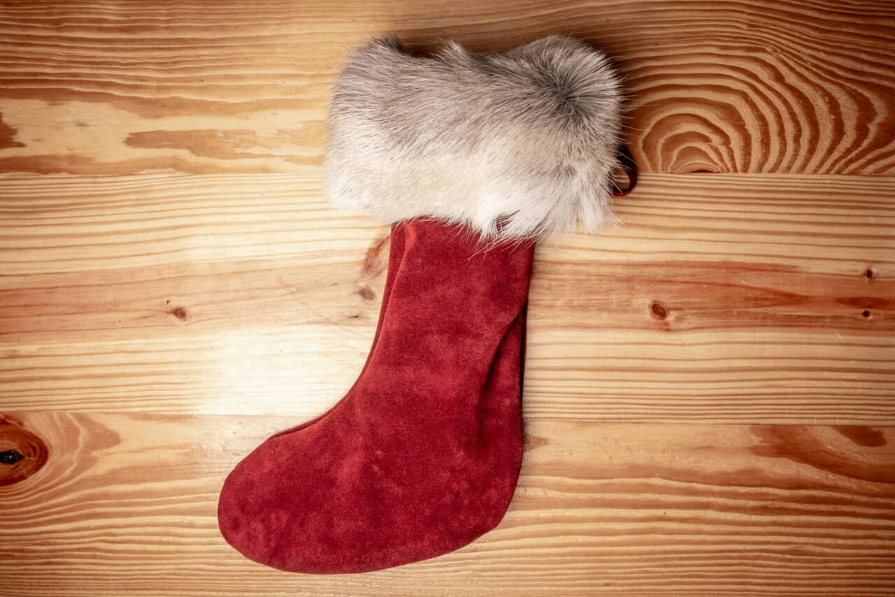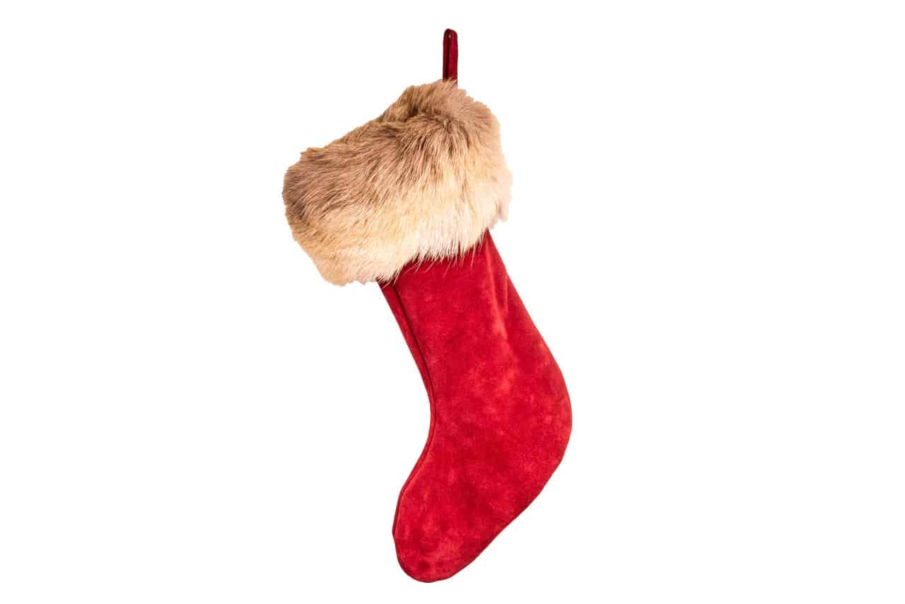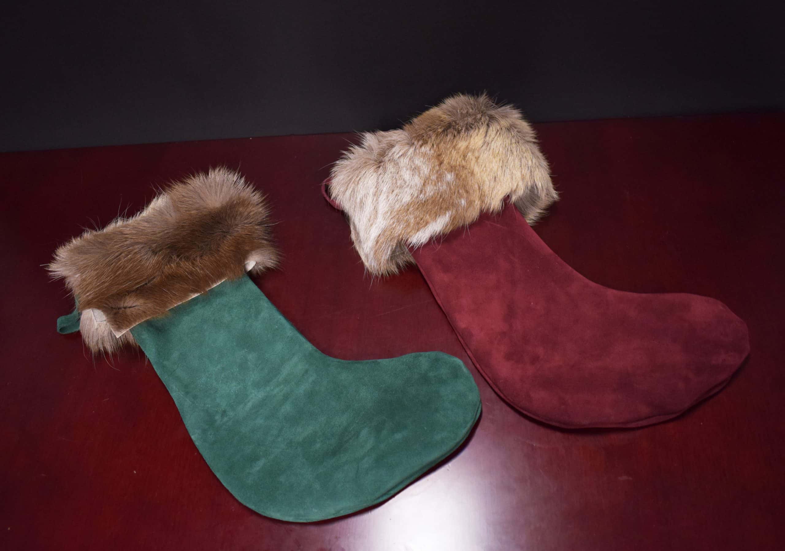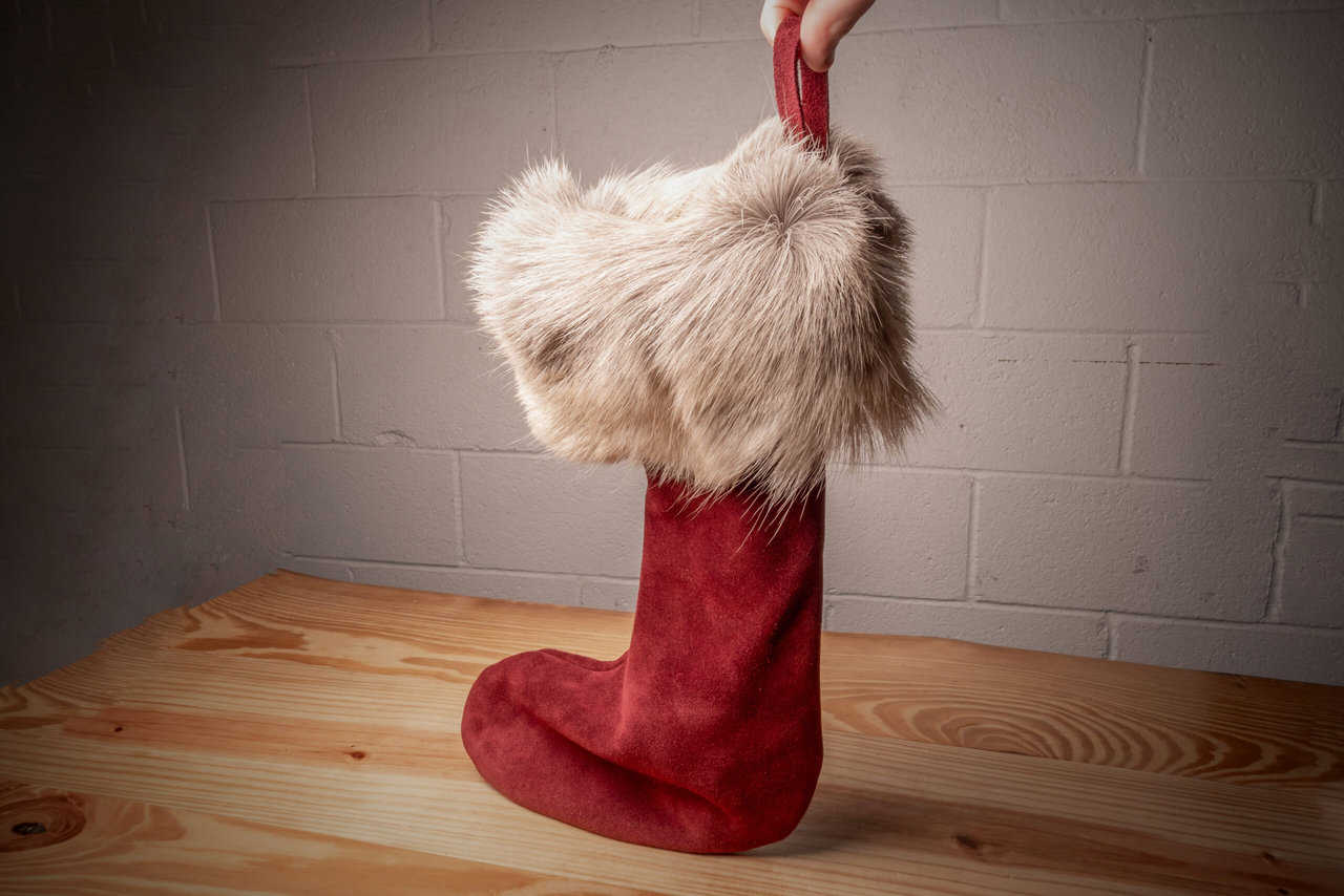 This is a handmade leather Christmas stocking made out of suede with a reindeer fur cuff.