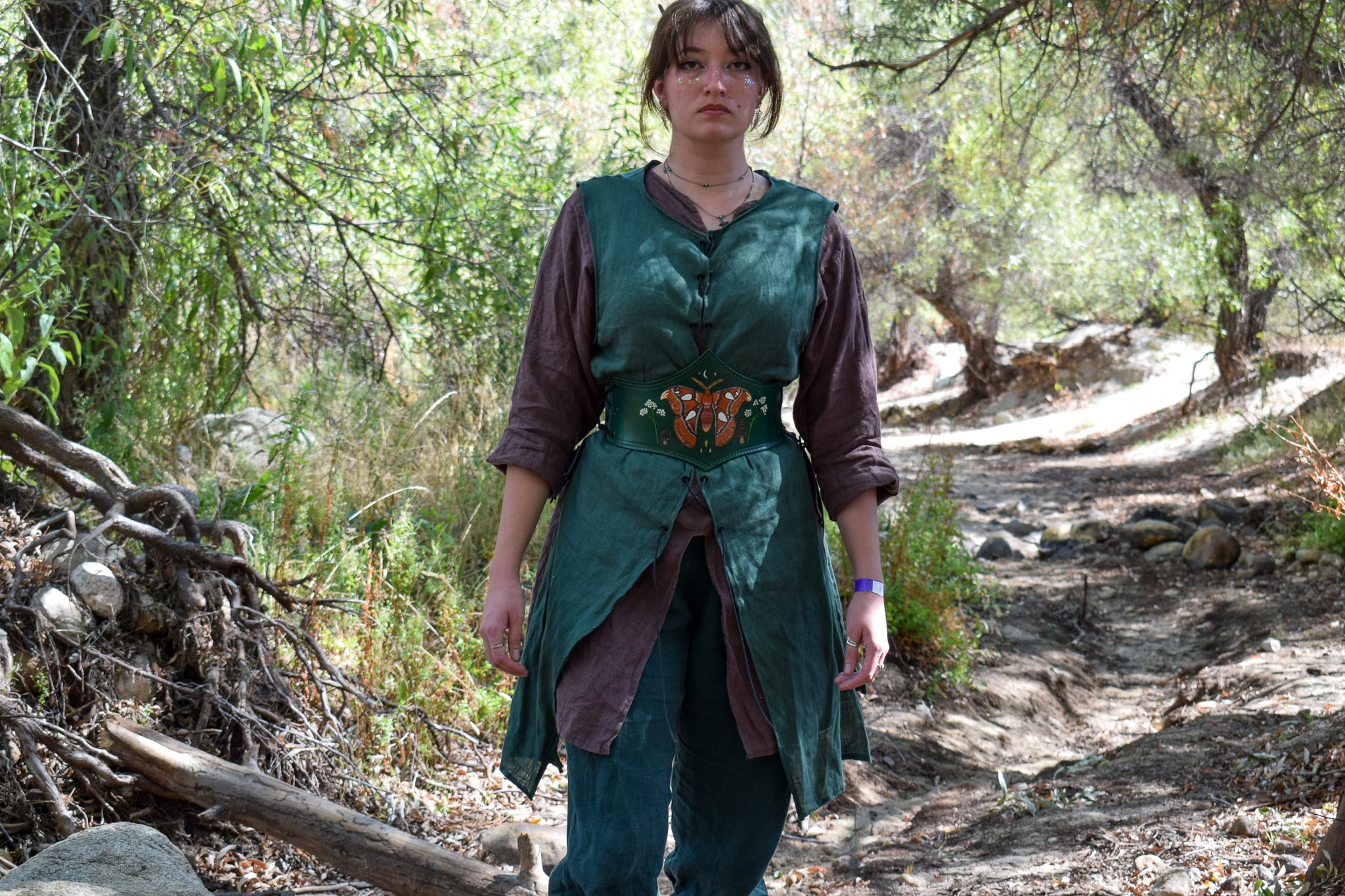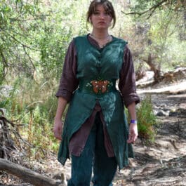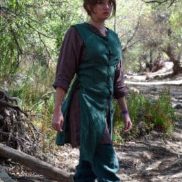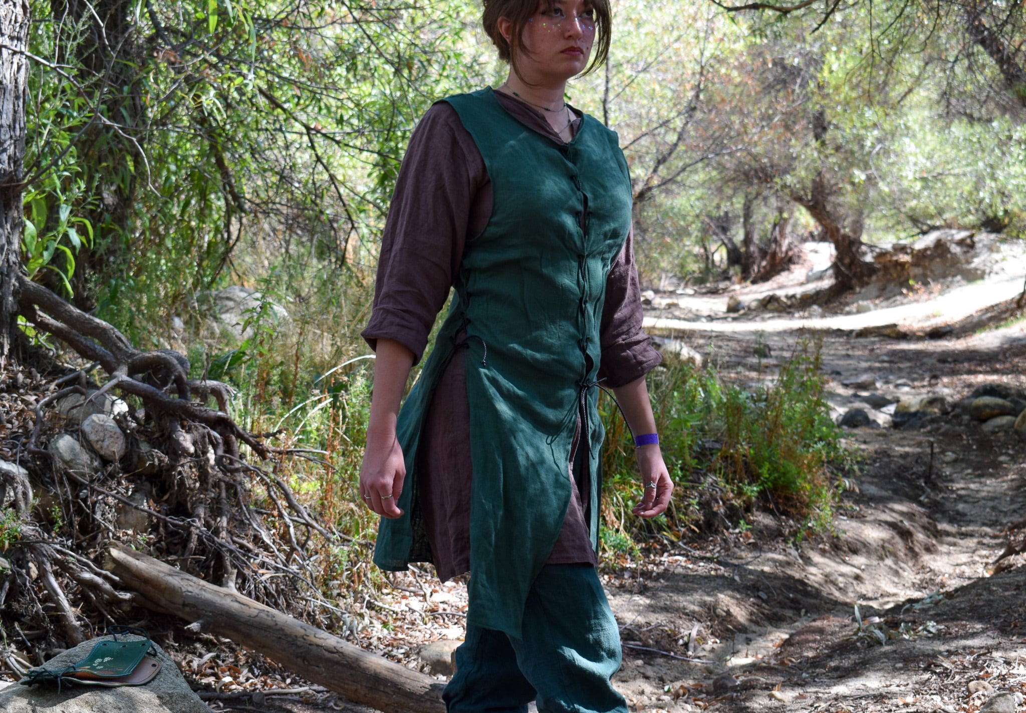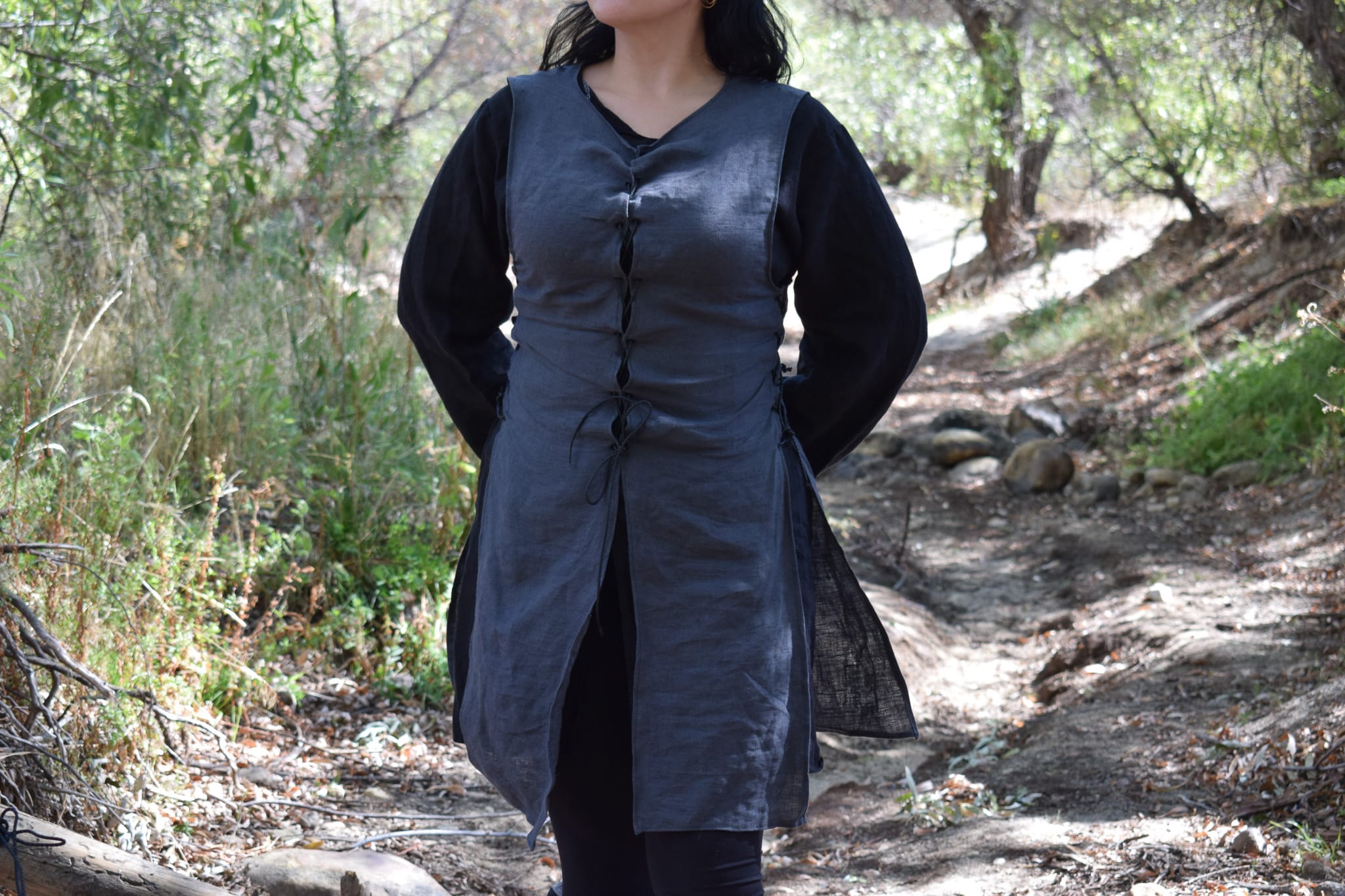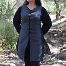 This is a jerkin/ jacket made out of the same medium weight linen that we use for our linen cloaks. Similar to our standard ranger jerkin, but tailored a bit more around the hips, chest, and arms.