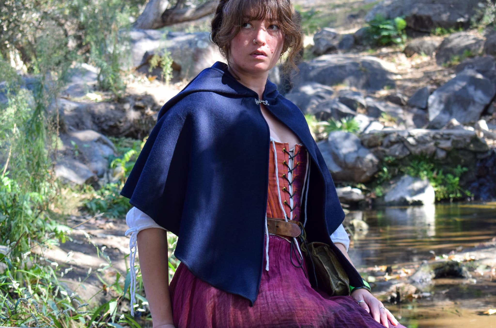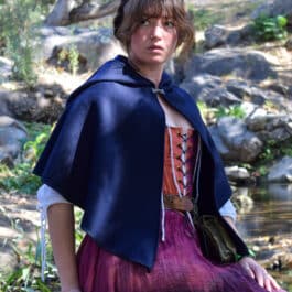 These are simple hooded cloaks made out of a medium weight wool blend. Similar to our full length hooded cloak, but shorter on the sides, coming to point in the front and back, with an oversized hood.
