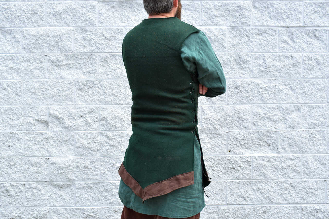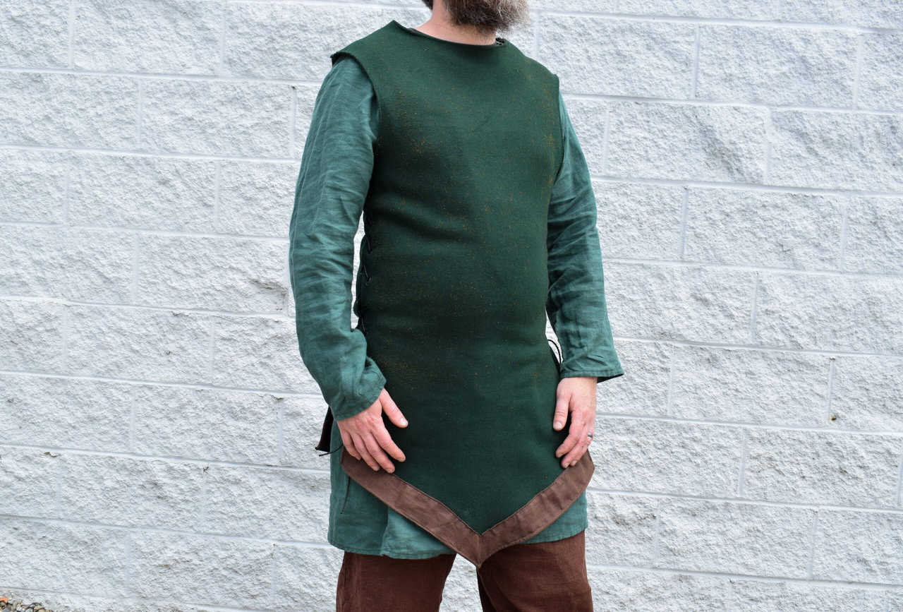 Each tabbard is closed in front with laces on the side. The front and back bottom edges are pointed and have a 2″ wide linen trim.