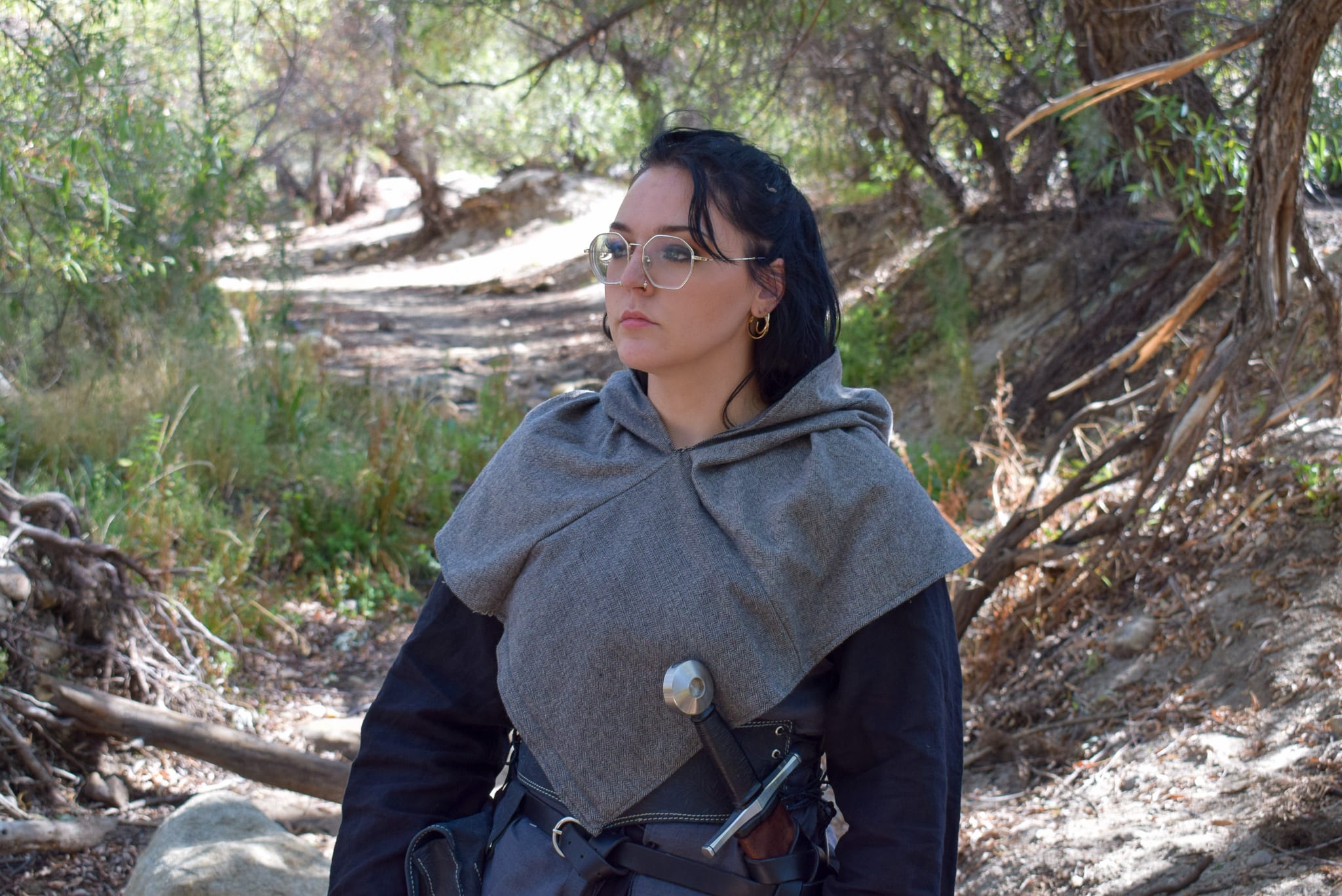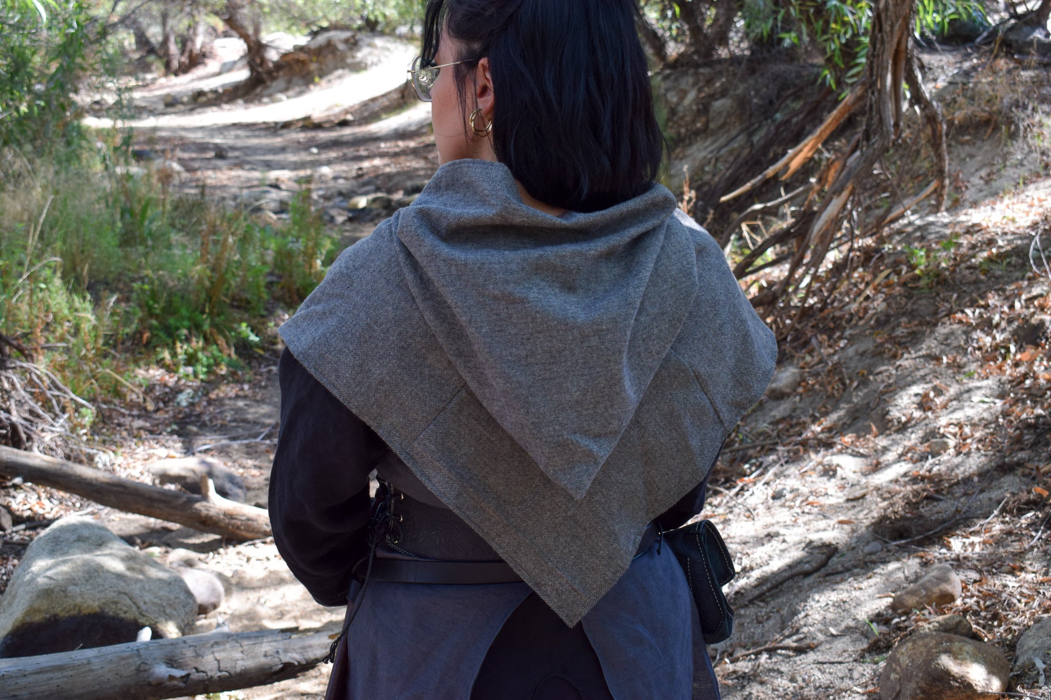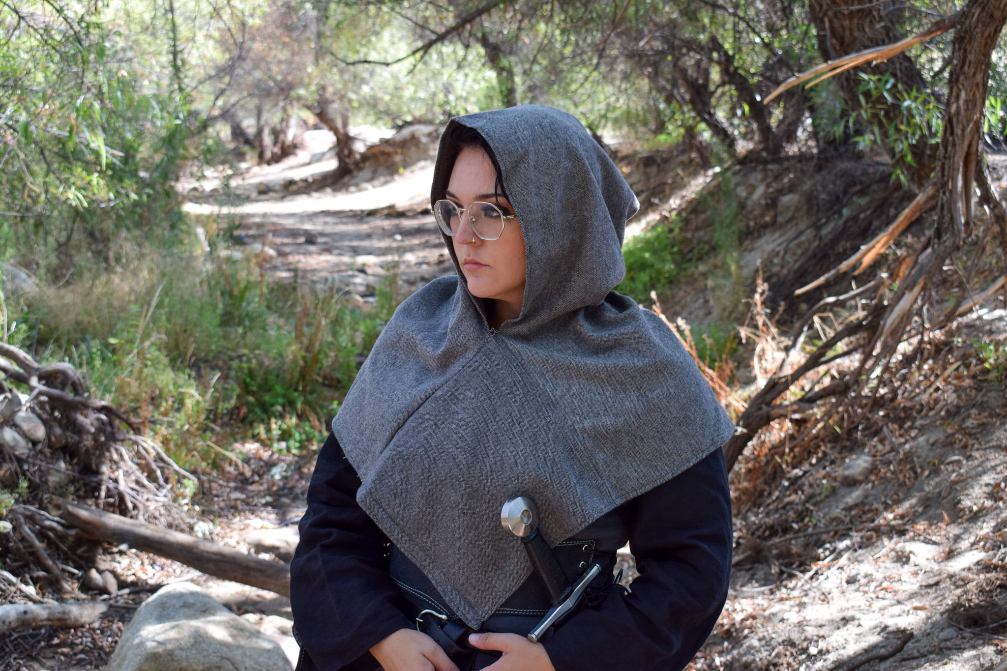 The hood fits over your head, and can be paired with a hoodless cloak, or worn alone to aid in keeping warm and looking awesome.